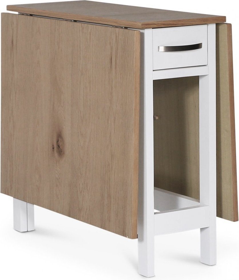 Fårö klaffbord med hvitt understell og bordplate av eikefiner. Laget av akasie, finér og MDF. Et stilig og praktisk bord, som også har en uttrekkskuff.