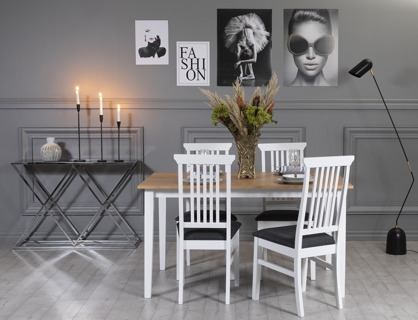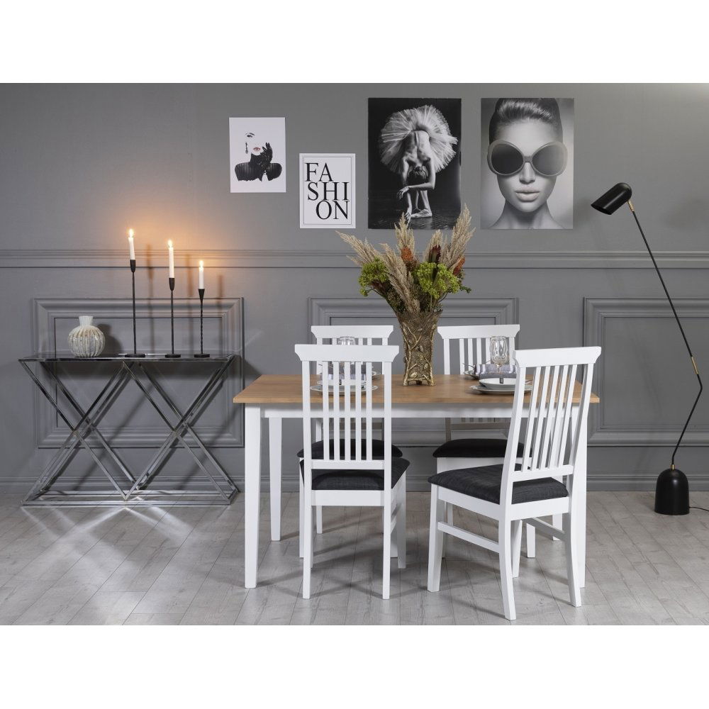 Klassisk spisegruppe, bord med stamme av massivt hvitlakkert tre, bordplate av MDF med slitesterk oljet eikefiner. Denne spisegruppen finnes også med et 180 cm bord. Moderne stol i massivt heveatre, hvitlakkert med polstret mykt sete av grått stoff.