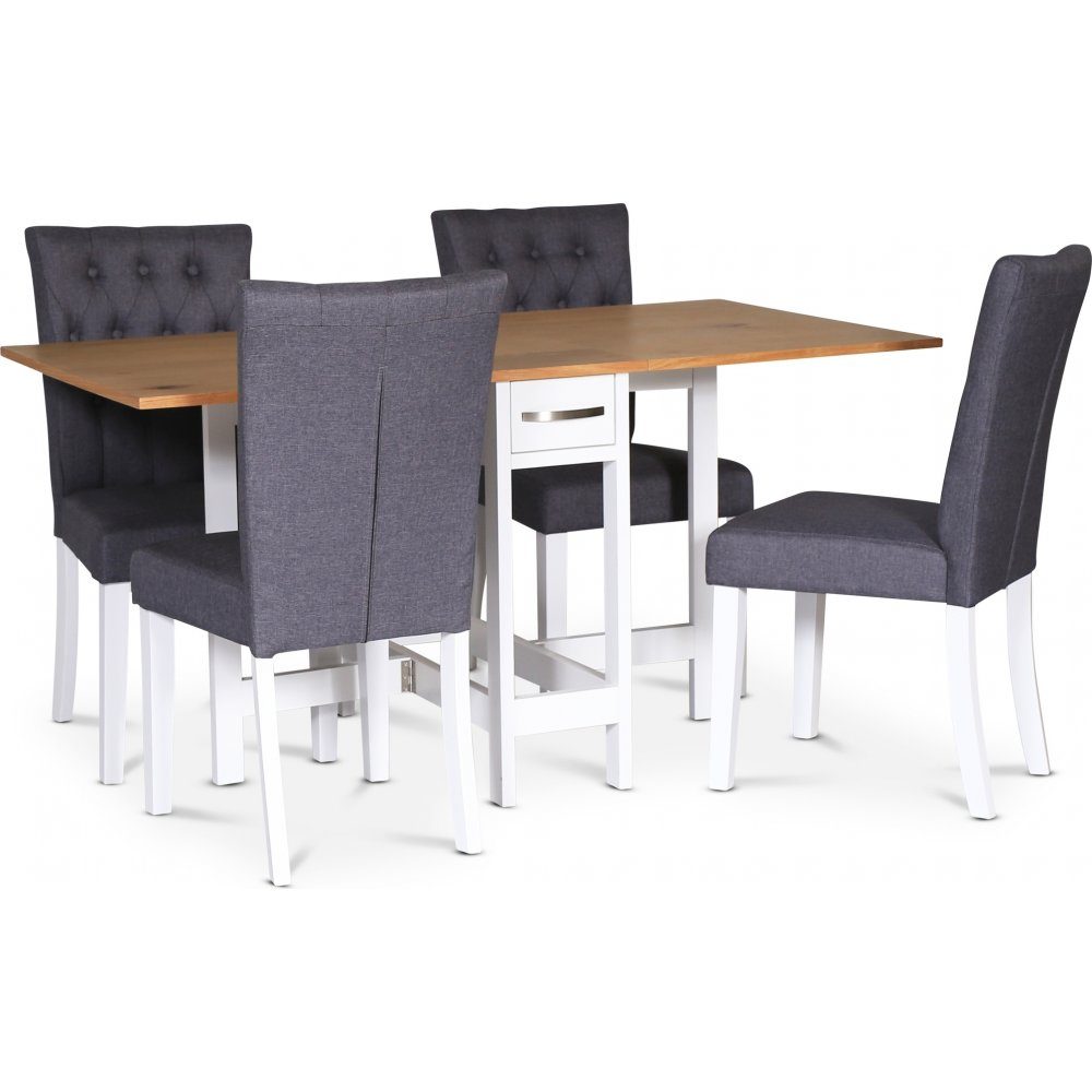 Fårö spisegruppe; Fårö klaffbord i eik/hvit med 4 grå Crocket-stoler