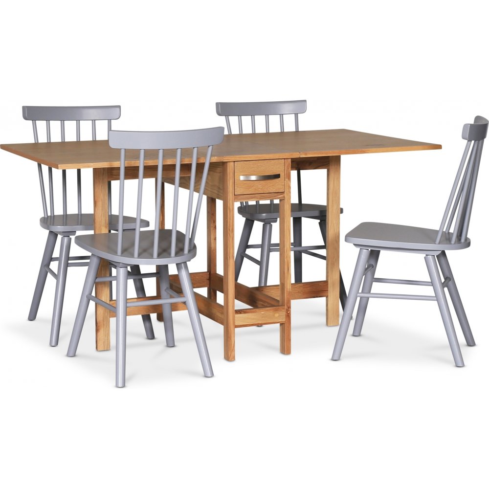 Fårö spisegruppe; Fårö klaffbord i eik med 4 grå Orust pinnestoler
