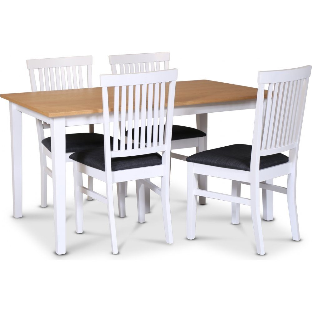 Fårö spisegruppe; spisebord 140x90 cm - Hvit / oljet eik med 4 Fårö spisestoler med ribber i ryggen, sete i grått stoff