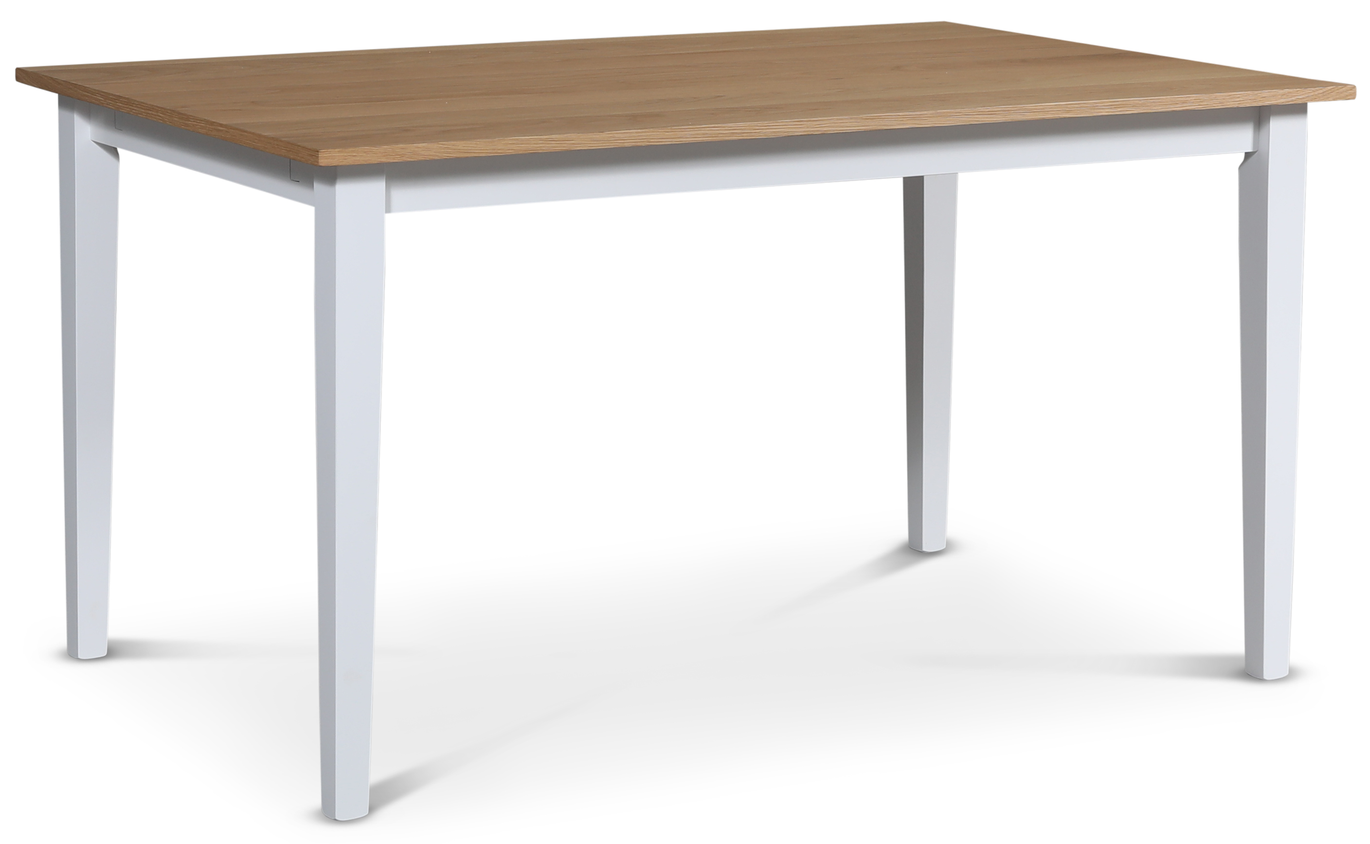 Fårö spisegruppe fra Skånska Möbelhuset, klassisk spisebord 140x90 cm med hvitt understell og et bordplate i oljet eikefiner. Det inkluderer 4 matchende Danderyd No.16 spisestoler i svartlakkert tre med rottingsete.