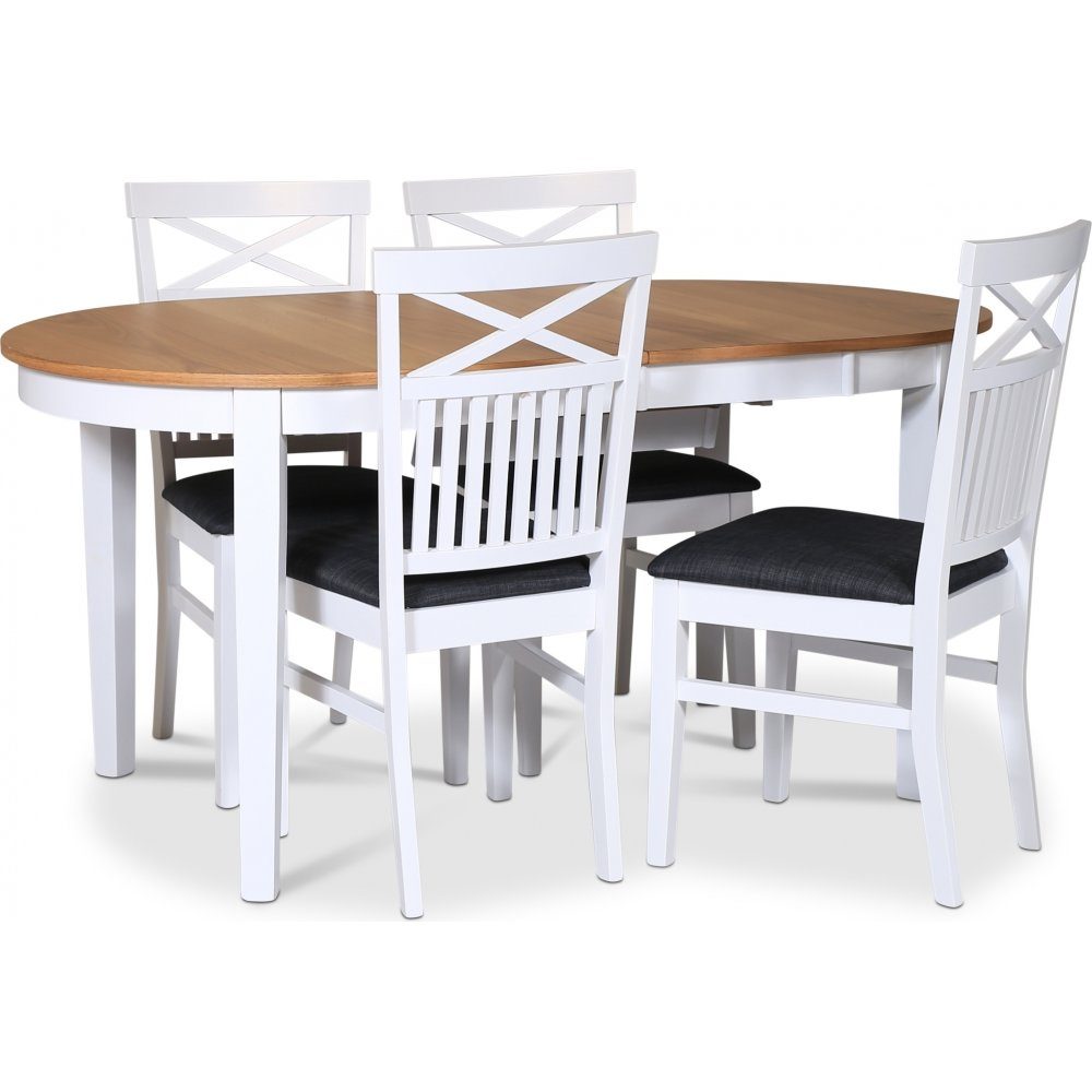 Fårö spisegruppe fra Skånska Möbelhuset, klassisk spisebord 160/210x90 cm med hvit understellet og et bordplate i oljet eikefiner. Den inkluderer 4 matchende Fårö spisestoler med et kryss i ryggen, hvitlakkert treramme med sete i grått stoff.