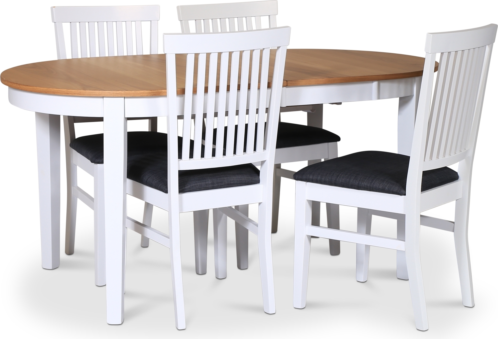 Fårö spisegruppe fra Skånska Möbelhuset, klassisk spisebord 160/210x90 cm med hvit understellet og et bordplate i oljet eikefiner. Den inkluderer 4 matchende Fårö spisestoler i hvitlakkert treramme med sete i grått stoff.