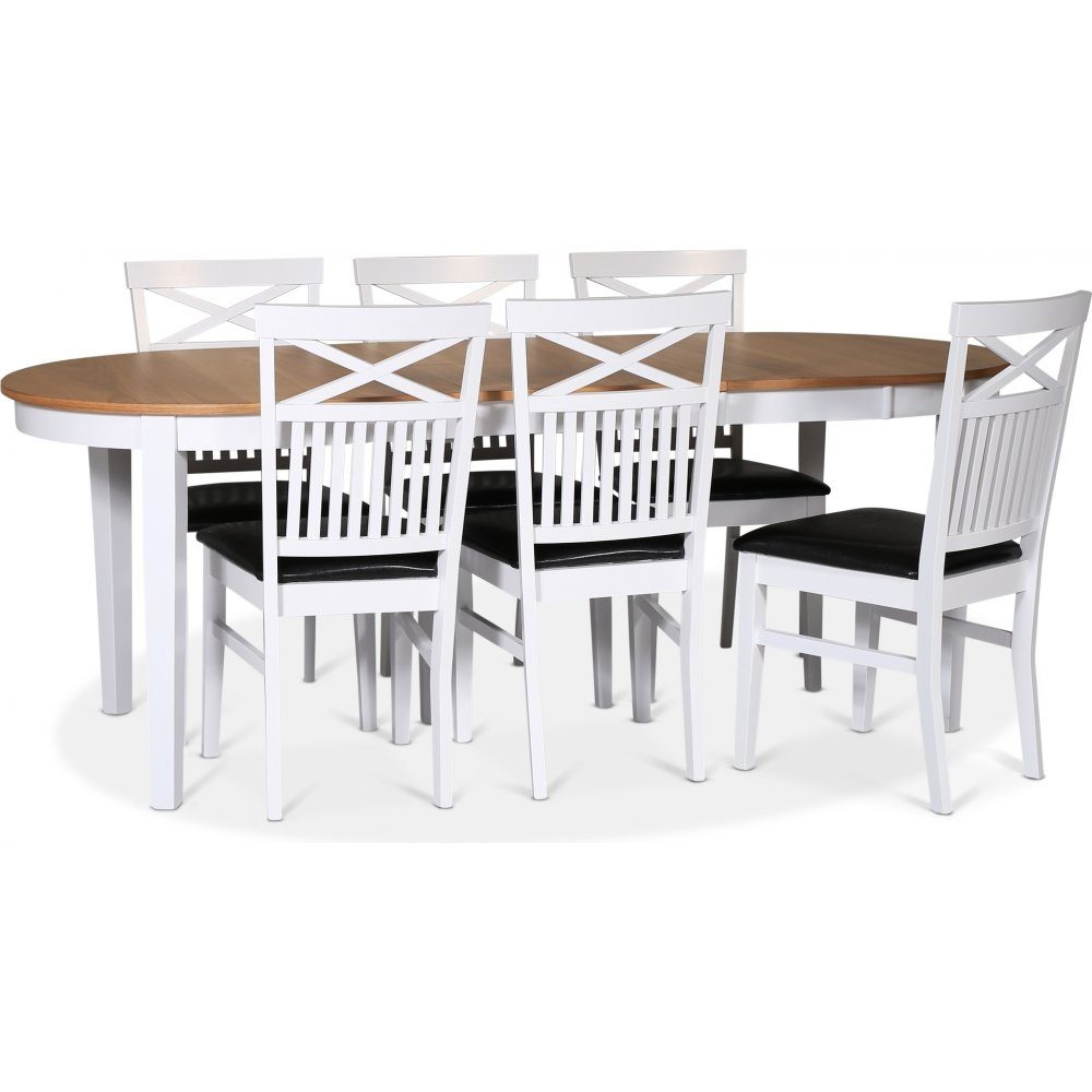 Fårö spisegruppe; spisebord 160/210x90 cm - Hvit / oljet eik med 6 Fårö stoler med kryss i ryggen, sete i svart PU