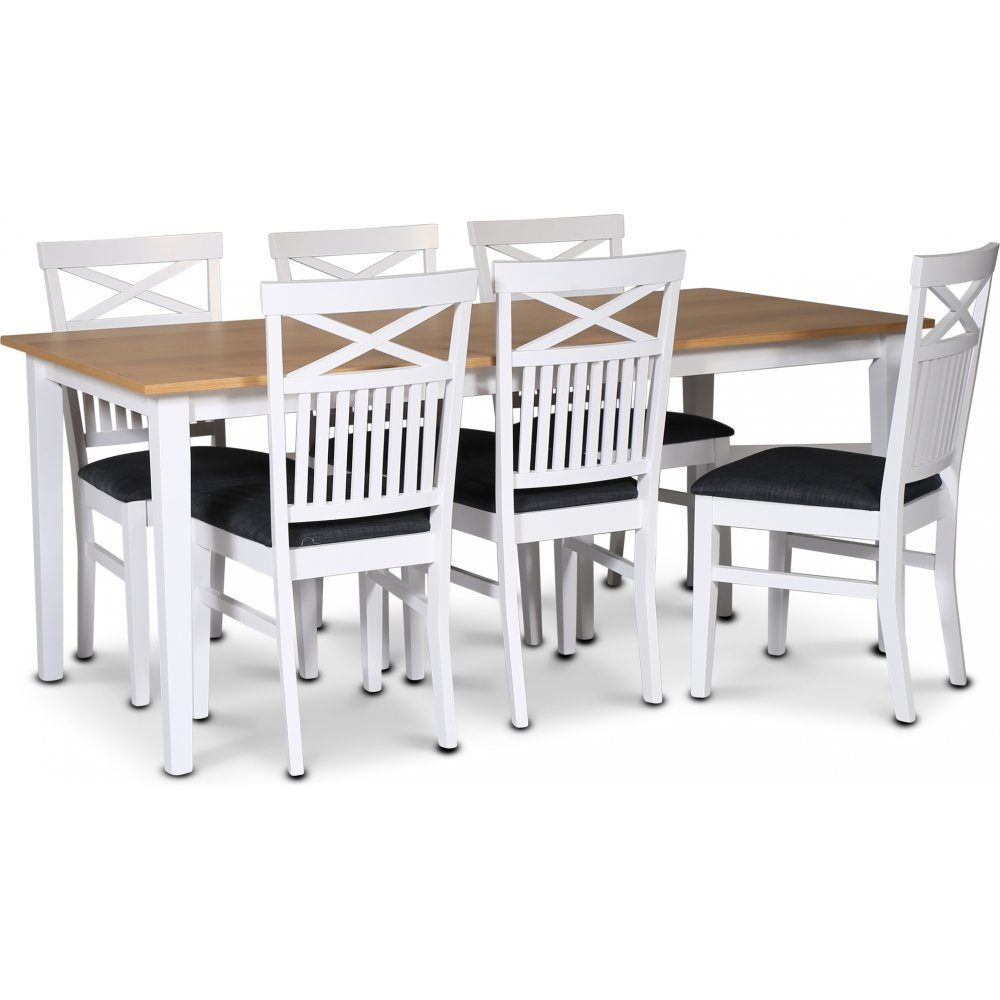 - Fårö spisegruppe; spisebord 180x90 cm - Hvit / oljet eik med 6 Fårö spisestoler med kryss i ryggen, sete i grått stoff