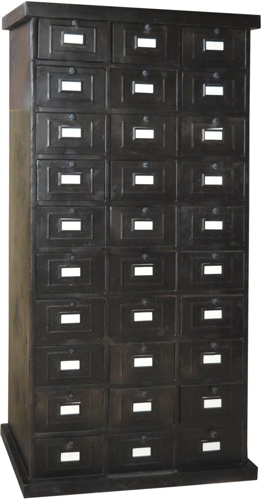 Skåp med goda förvaringsmöjligheter, tillverkat av svart metall. Passar för att förvara skrymande prylar i någon av de 30 mindre lådorna. Hvita handtag. Denne möbel er i industriell stil.
