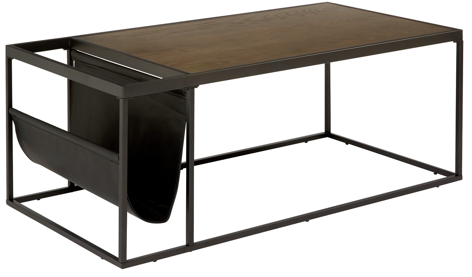 Felipe rektangulært salongbord i brun eikefiner, understell i metall og magasinholder i sort PU.