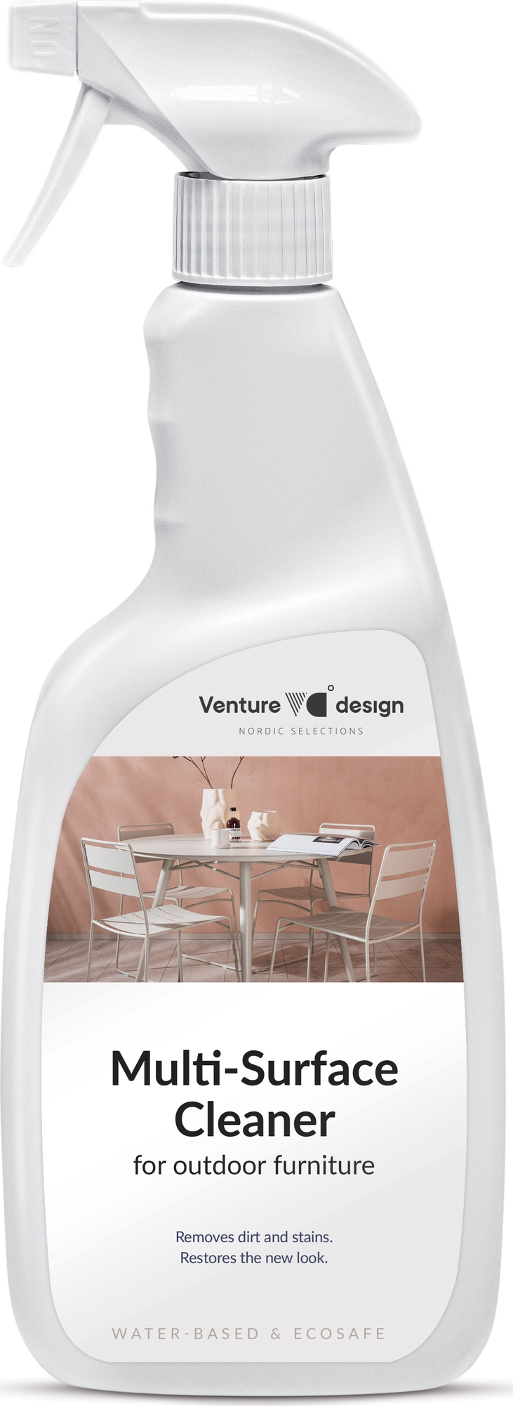 Denne multi-overflaterenseren kan brukes på aluminium, stein, rustfritt stål, rotting, HPL, polywood og andre harde materialer. Rengjøringsmidlet er enkelt å påføre og fjerner aktivt smuss og flekker som har oppstått under bruk. Gi møblene dine et nytt liv og gjenopprett utseendet ved å vaske møblene regelmessig, minst en gang i sesongen, slik at skitten ikke legger seg. Rensemidlet er vannbasert og slutter å feste seg etter 30 minutter og virker vannavstøtende etter 48 timer.