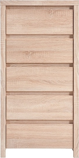 En stilren byrå i lys eik imitasjon med 5 lette skuffer som passer i det moderne hjemmet. Med dens kompakte med likevel romslige størrelse passer den inn i soverommet såvel som hallen.