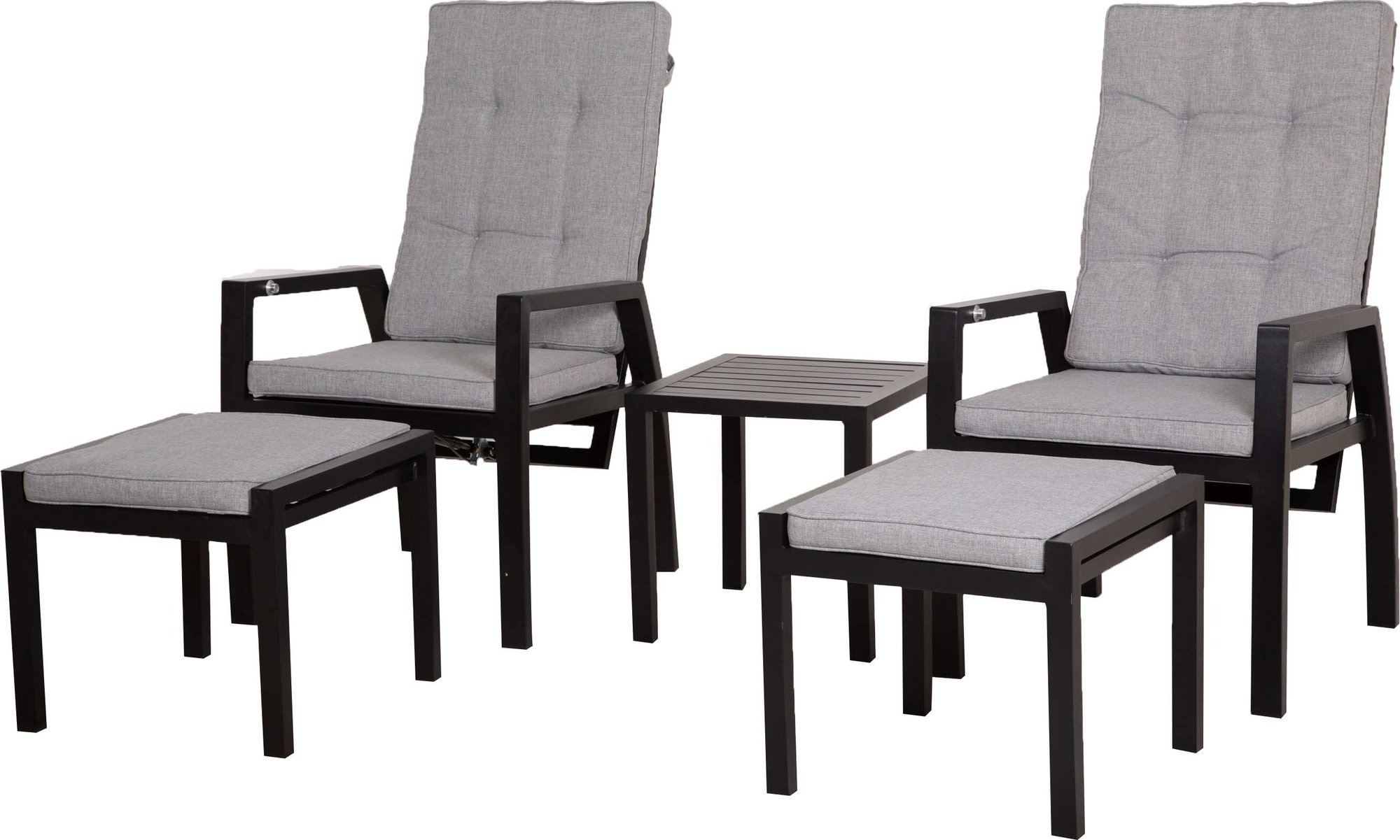 Loungegruppe laget av aluminium. Trukket med polyester.