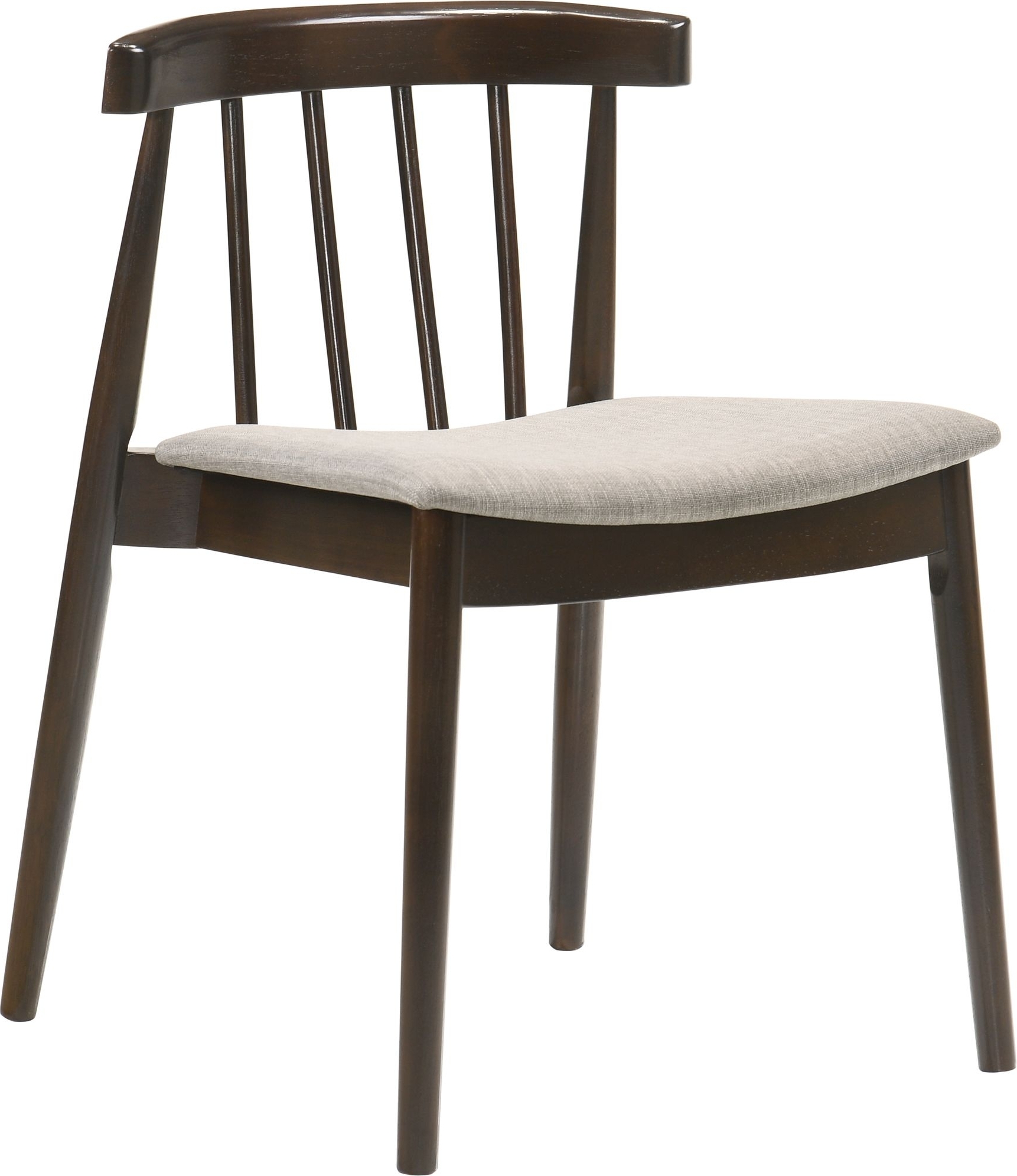 De tilhørende Florence-stolene er laget av heltre med en vakker valnøttbeis. Den buede ryggstøtten med dekorative ribber gir både karakter og god sittekomfort, mens den lysegrå sitteputen gir en myk, moderne kontrast til det mørke treverket.