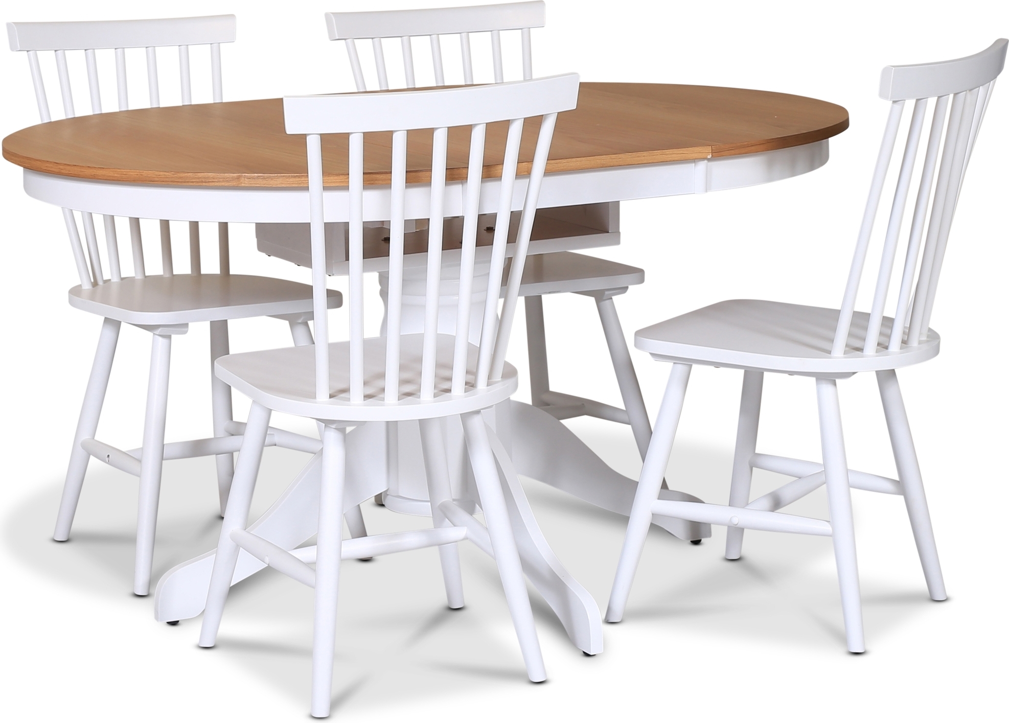 Fitchburg spisegruppe; rundt spisebord 106 /141 cm - Hvit / oljet eik med 4 hvite Karl pinnestoler + Møbelføtter