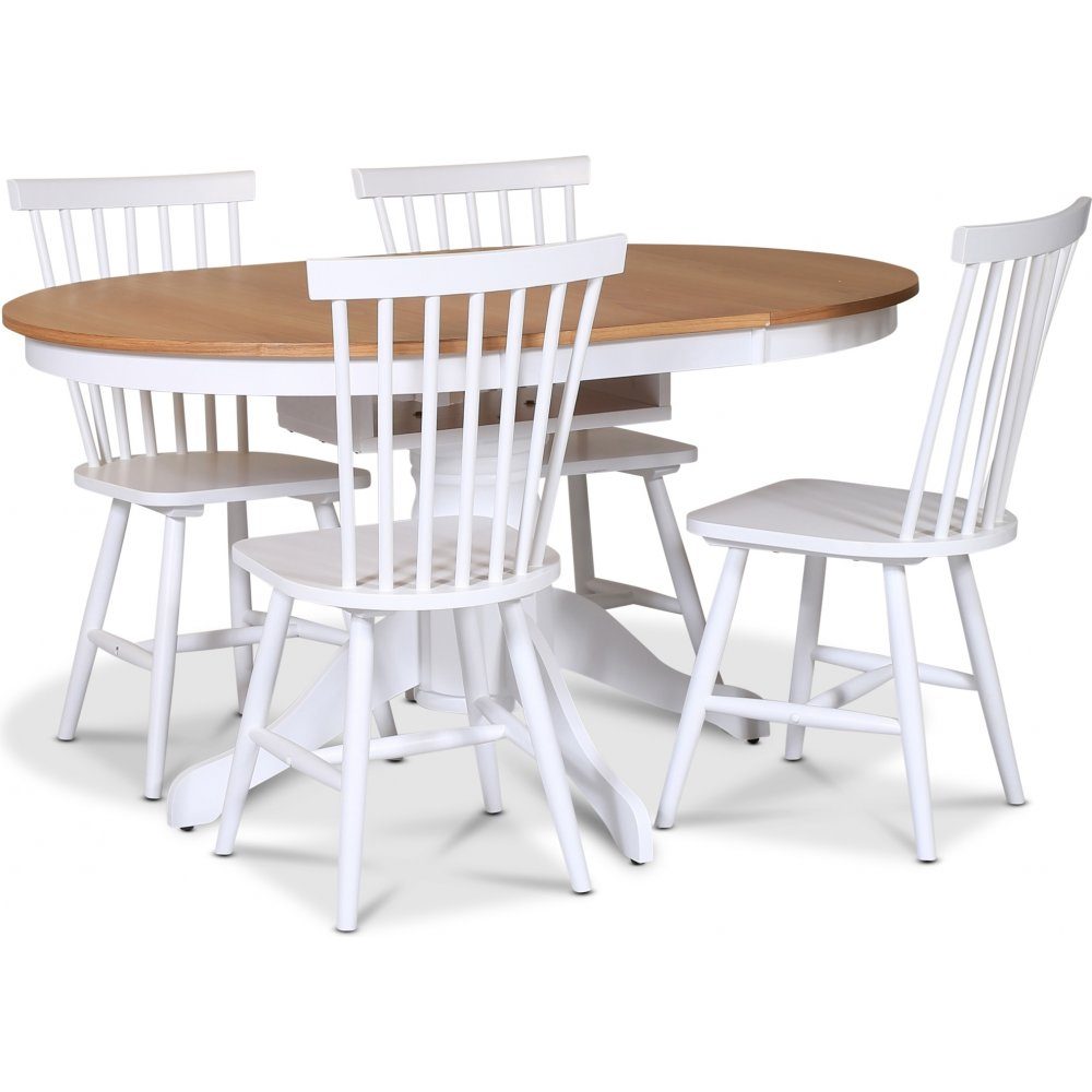- Fitchburg spisegruppe; rundt spisebord 106 /141 cm - Hvit / oljet eik med 4 hvite Karl pinnestoler