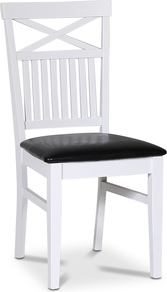 Fitchburg spisegruppe fra Skånska Möbelhuset, klassisk rundt spisebord 106 cm i diameter, kan utvides til ovalt bord 141 cm, med hvit understell og en bordplate i oljet eikefiner. Det inkluderer 4 matchende Fårö spisestoler med et kryss i ryggen, hvitlakkert tre med sete i svart PU.