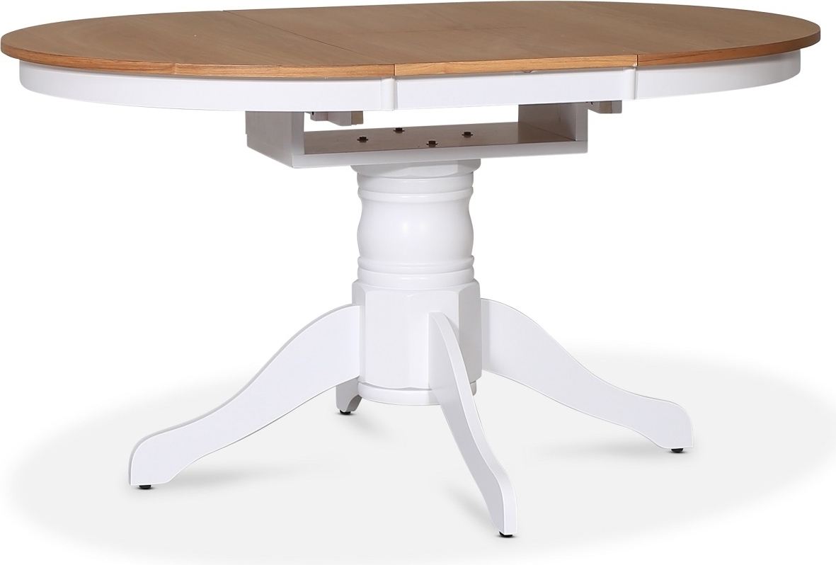 Fitchburg spisegruppe fra Skånska Möbelhuset, klassisk rundt spisebord 106 cm i diameter, kan utvides til ovalt bord 141 cm, med hvit understell og en bordplate i oljet eikefiner. Den inkluderer 4 matchende Fårö spisestoler i hvitlakkert tre med sete i grått stoff.