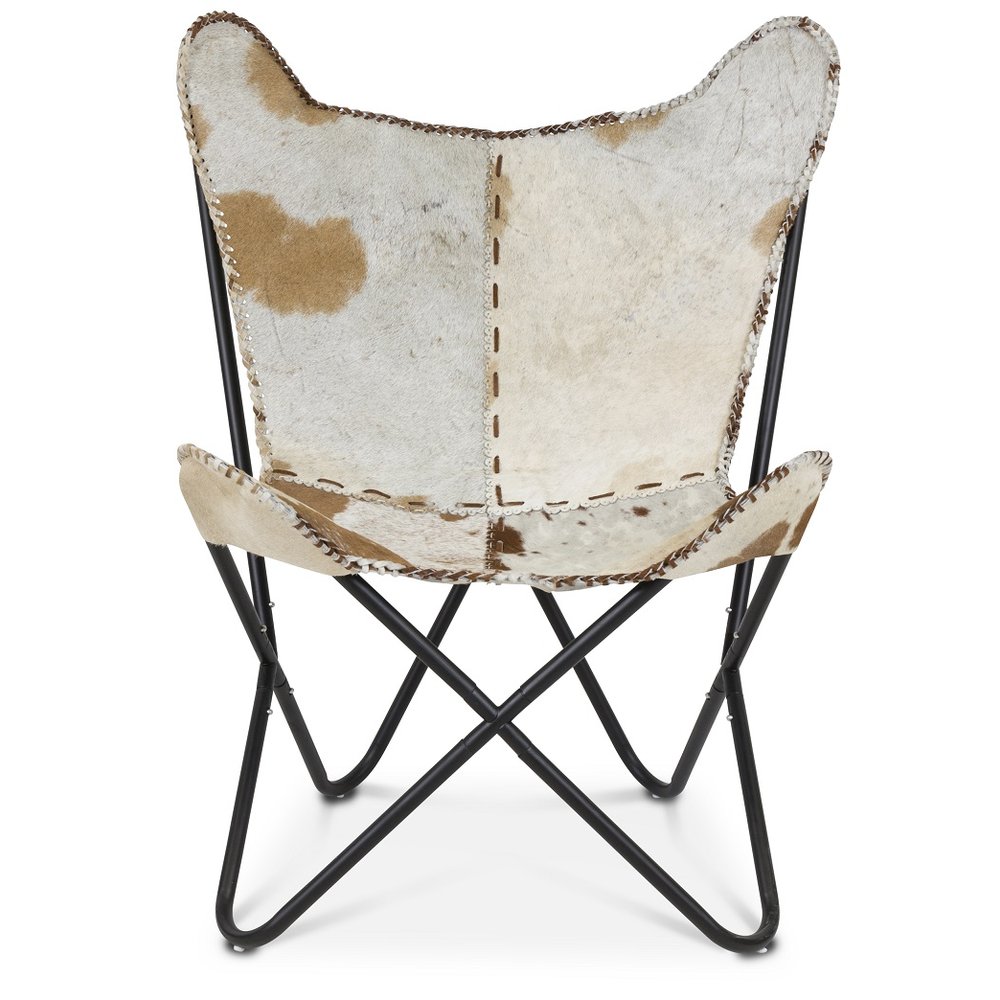 Klassisk stol i flaggermusinspirert design. Utførelse i brunt og hvitt kuskinn gir et fint samspill mot stolens sortlakkerte metallunderstell.