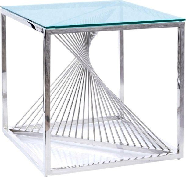 Salongbord laget av rustfritt stål. Bordplate laget av temperert glass.