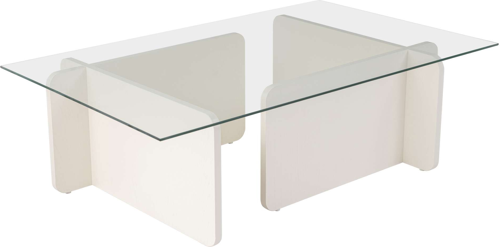 Salongbord laget av melaminbelagt sponplate og herdet glass.
