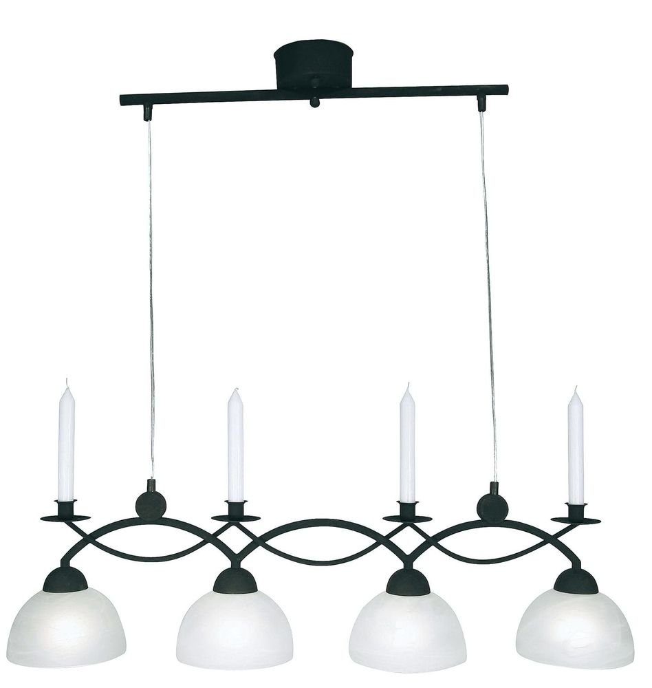 Herlig taklampe med en tidløs design. Tilvirket i antikk svart metall og hvite murano glass skjermer. Fire sokler og fire lysestaker.