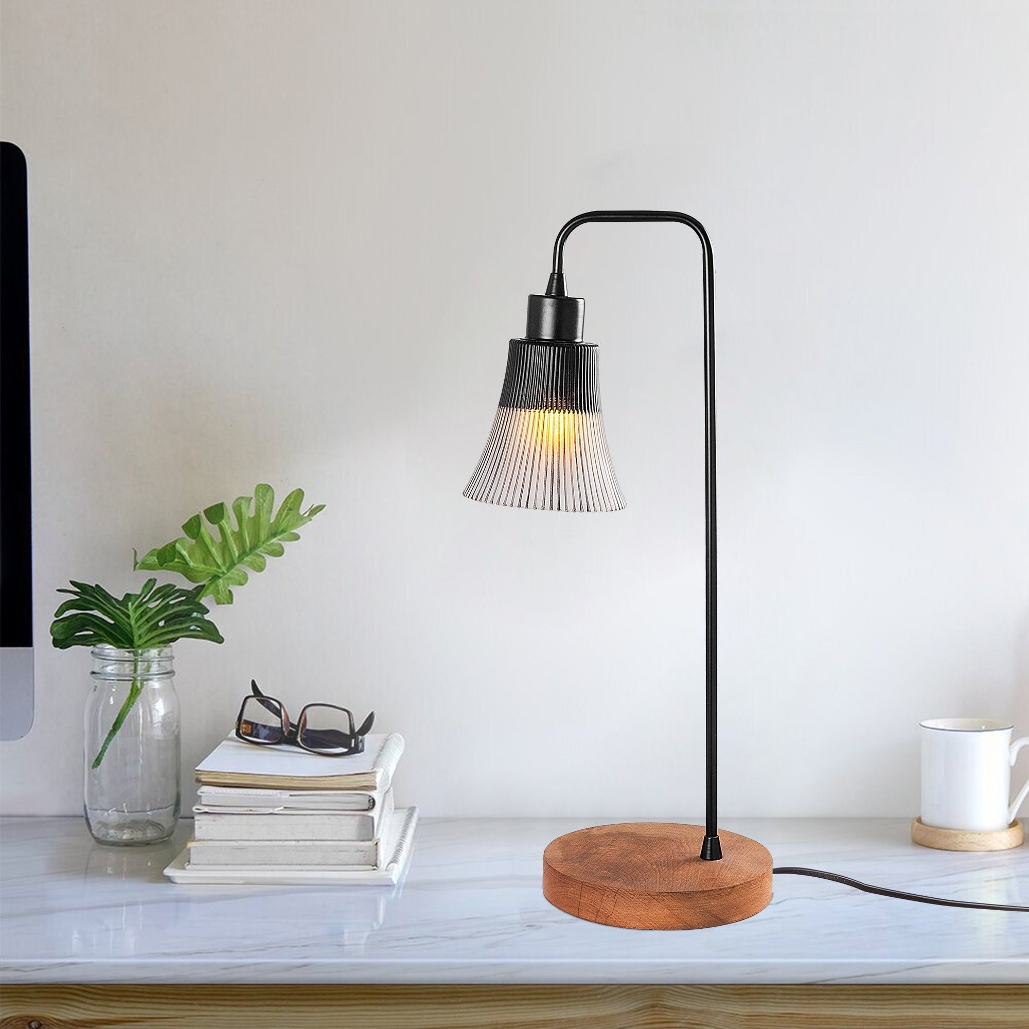 Bordlampe laget av tre, metall og glass. Lyskilde er ikke inkludert.