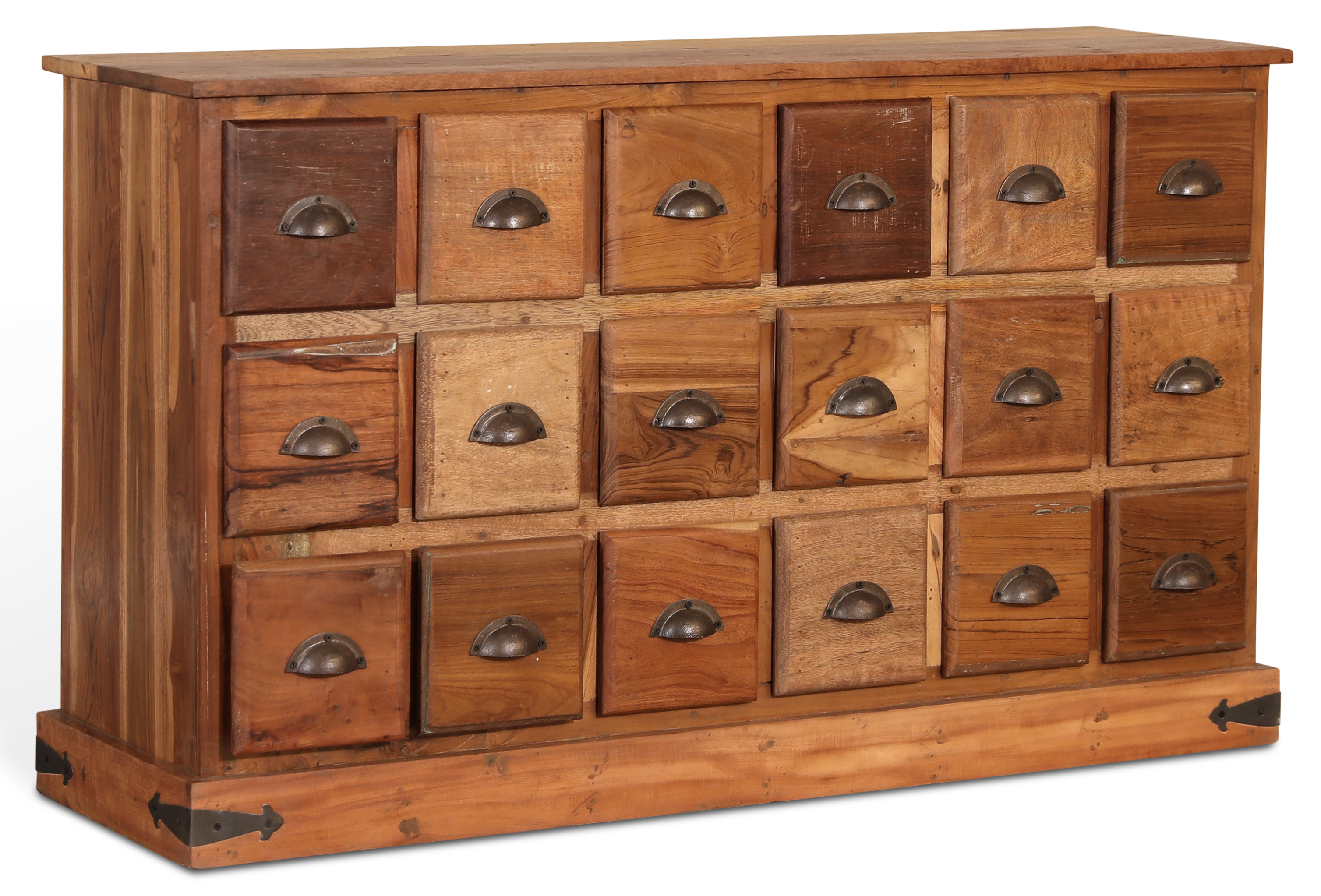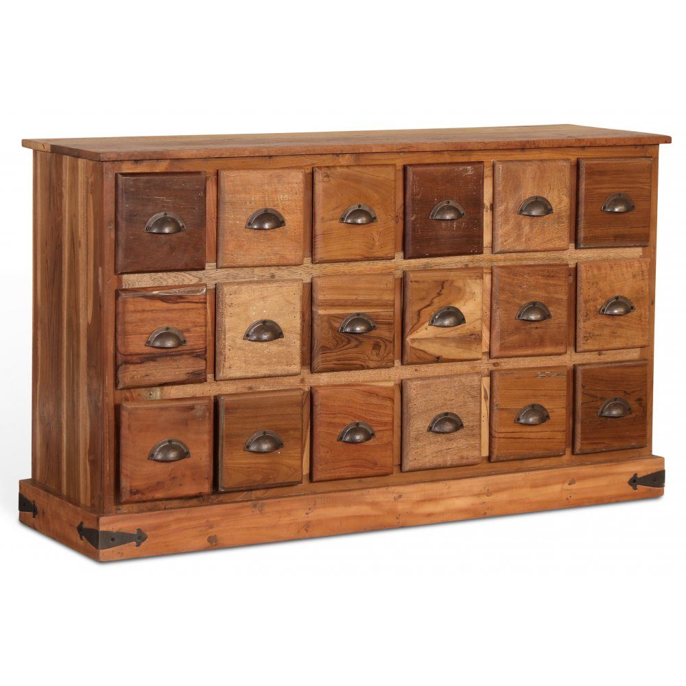 Folkabo er en handelsdisk laget av solid mangotre med 18 mindre skuffer. Håndtak i svart metall. Handelsdisken har små skavanker og merker for å gi et vintageutseende.