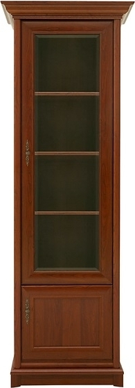 Et smalt vitrineskap i kastanje med dekorative håndtak. Skapet har mange funksjonelle hylleplan og et mindre skap nedenfor der man kan oppbevare ting man vil skjule.