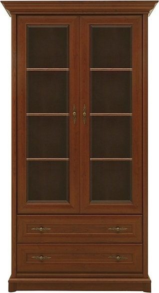 Et fint vitrineskap med doble dører i glass og dekorative håndtak. Skapet er innredet med mange praktiske hyller, og under er det skuffer til oppbevaring av småting.