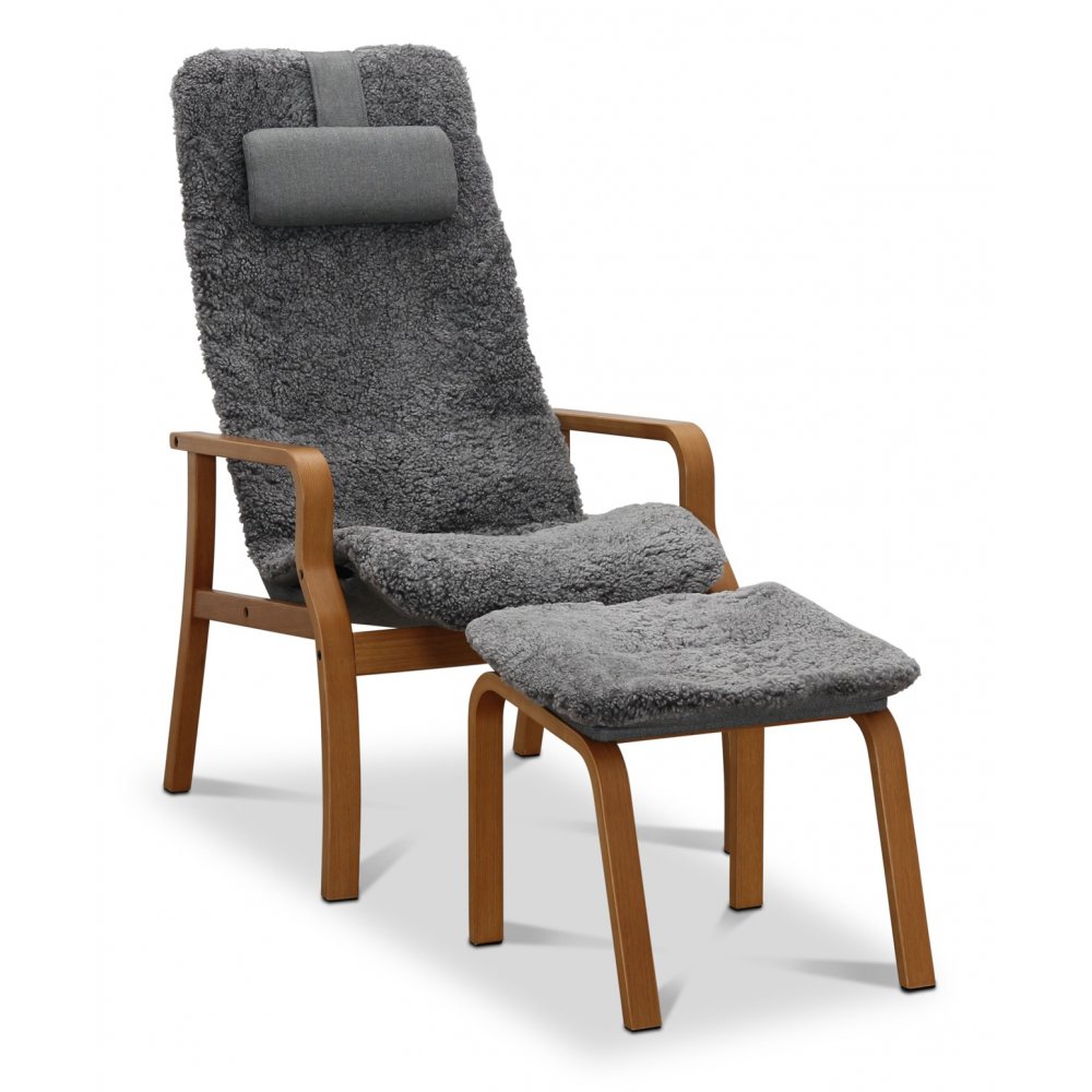 Lenestol i saueskinn + fotskammel i ekte saueskinn i eik/grå - Frank