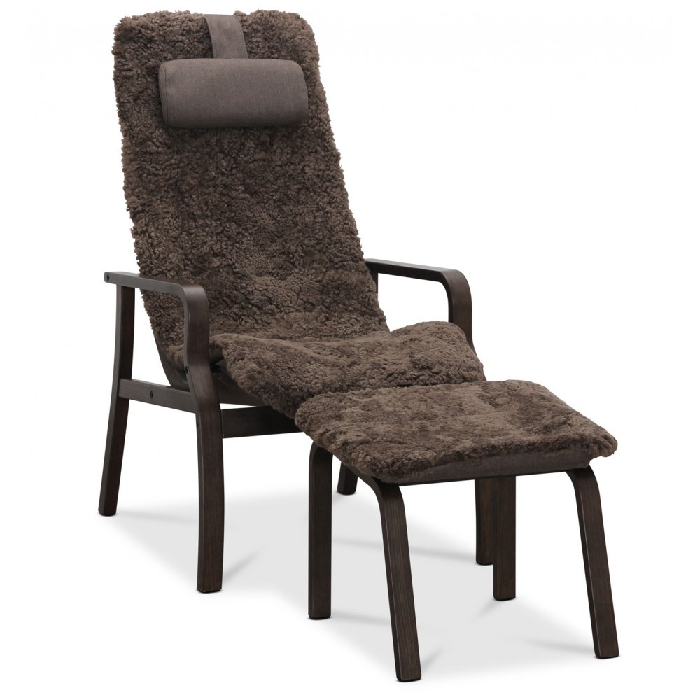 Lenestol med fotskammel i ekte saueskinn brun/eik - Frank