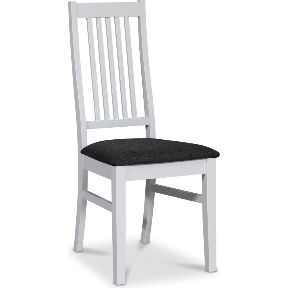 Klassisk stol i solid hvitlakkert tre, polstret sete i et slitesterkt grått stoff.