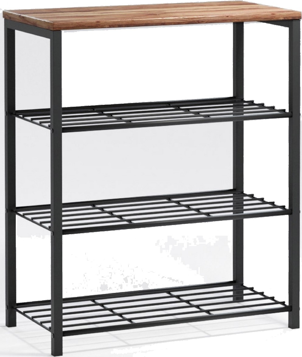 Hylle laget av tre og metall.