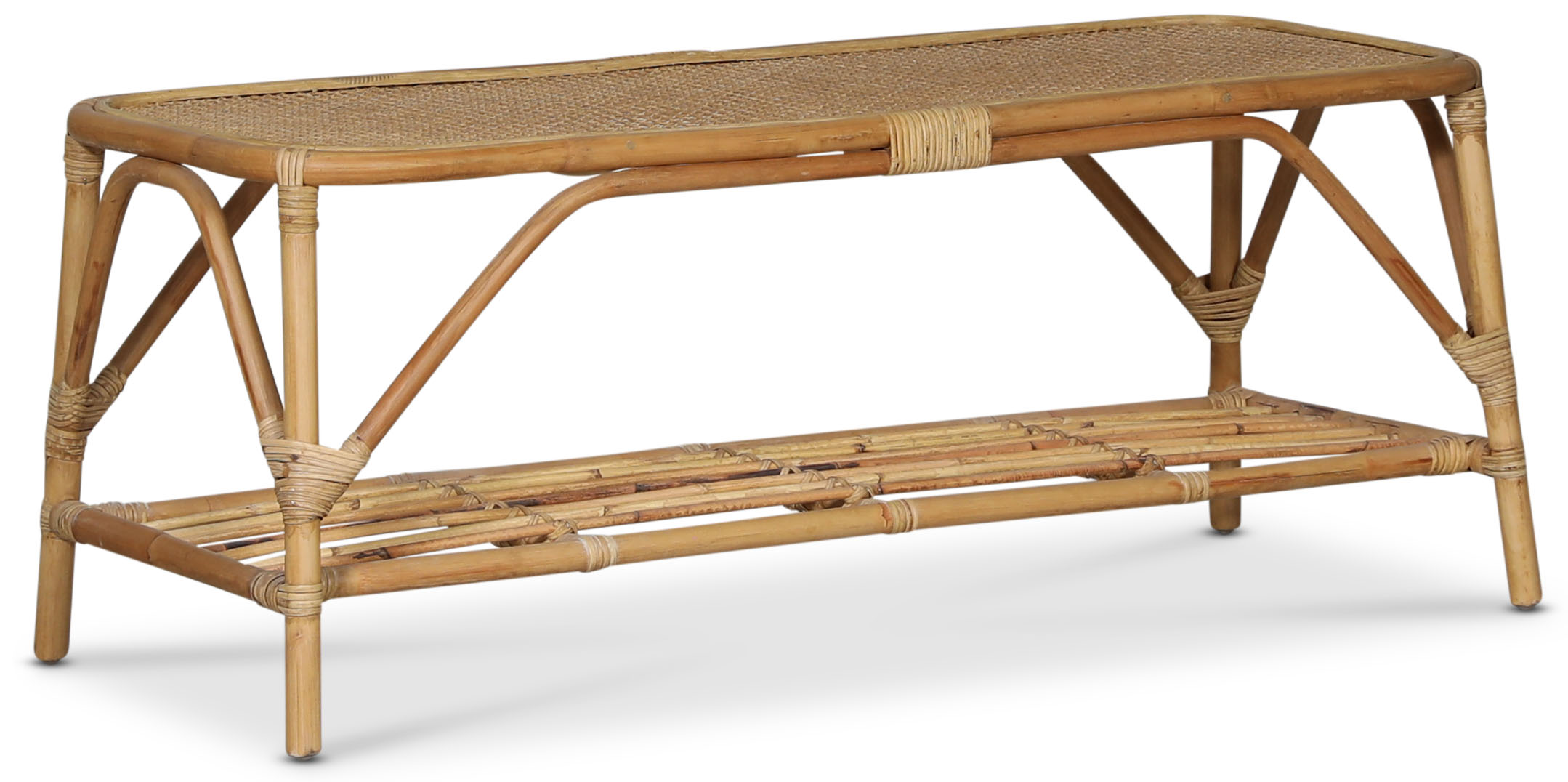 Salongbord i rotting, bundet i en stabil konstruksjon. Rotting er et naturlig materiale som er veldig holdbart og gir møblene en levende overflate. En annen fordel med rotting er at det er et lett materiale som gjør det enkelt å flytte rundt på møblene.