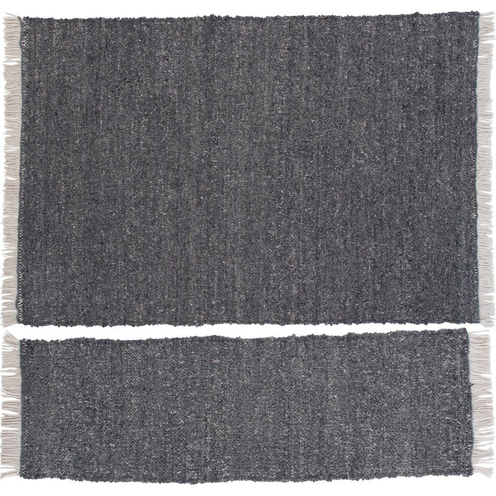 Ullteppe som er håndvevd med en teknikk som gir teppet en nydelig knutestruktur. Fargen er behagelig i en lekker, grå fargetone med en benhvit frynserad på kortsidene.