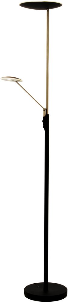 Gulvlampe i metall med svart og matt messingdesign. Takbelysning og justerbar spotlight. Strømbryter på stammen.