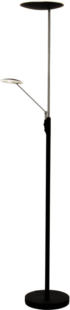 Gulvlampe i metall med svart og ståldesign. Takbelysning og justerbar spotlight. Strømbryter på stammen.