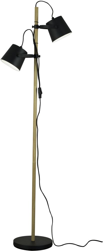 Gulvlampe i svart metall med detaljer i treutførelse. To lampehoder. Strømbryter på ledningen.