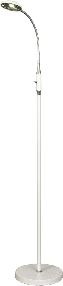 Gulvlampe i hvitt metall med detaljer i krom. Dreibart lampehode. Strømbryter på stammen.