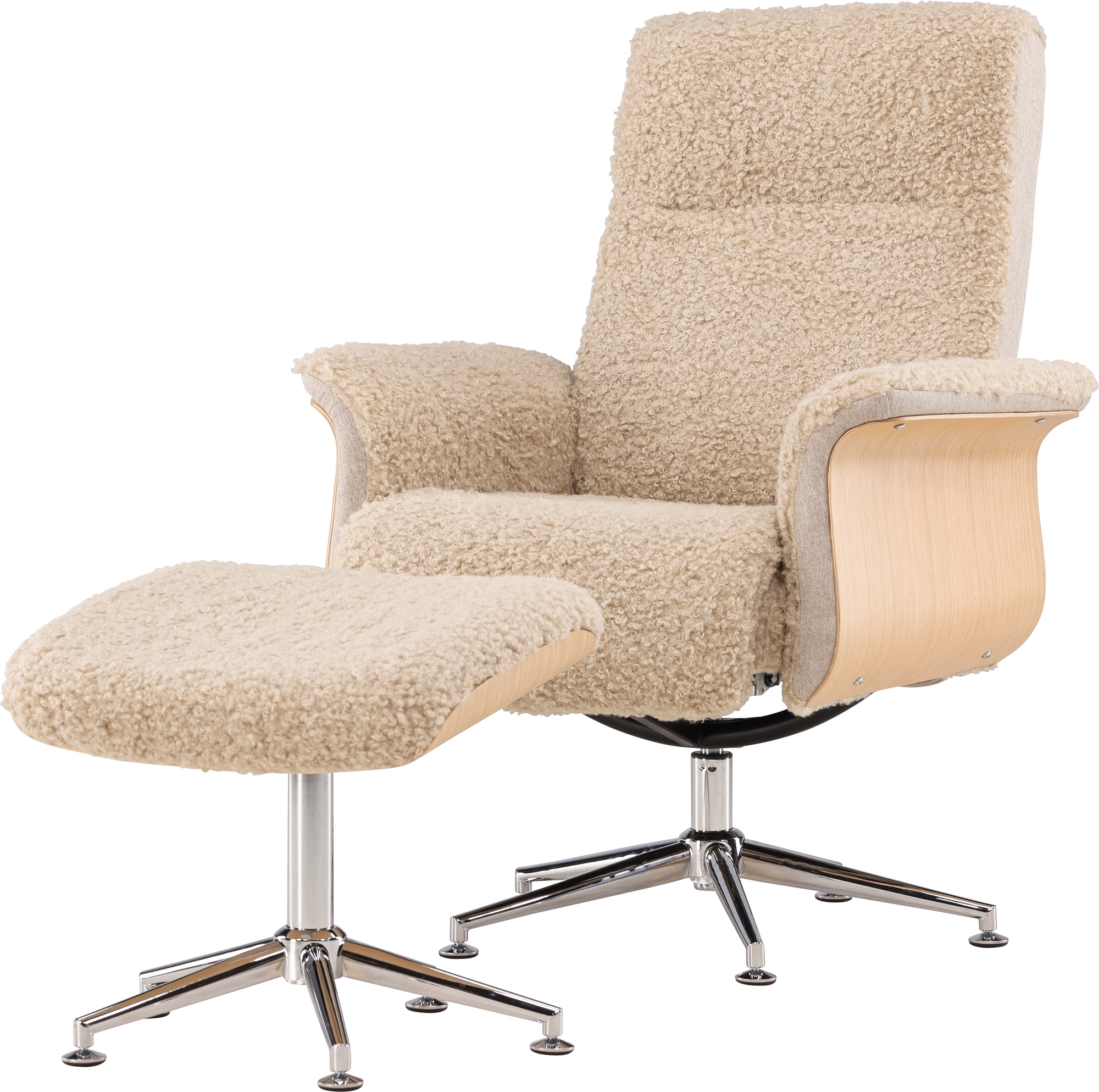Her i beige teddy med tre på sidene i oljet eikefinish og svingstativ i forkrommet metall for å gjengi et eksklusivt utseende og preg. Hvilefunksjonen kan stilles inn og låses i forskjellige posisjoner. Matchende fotskammel inkludert.