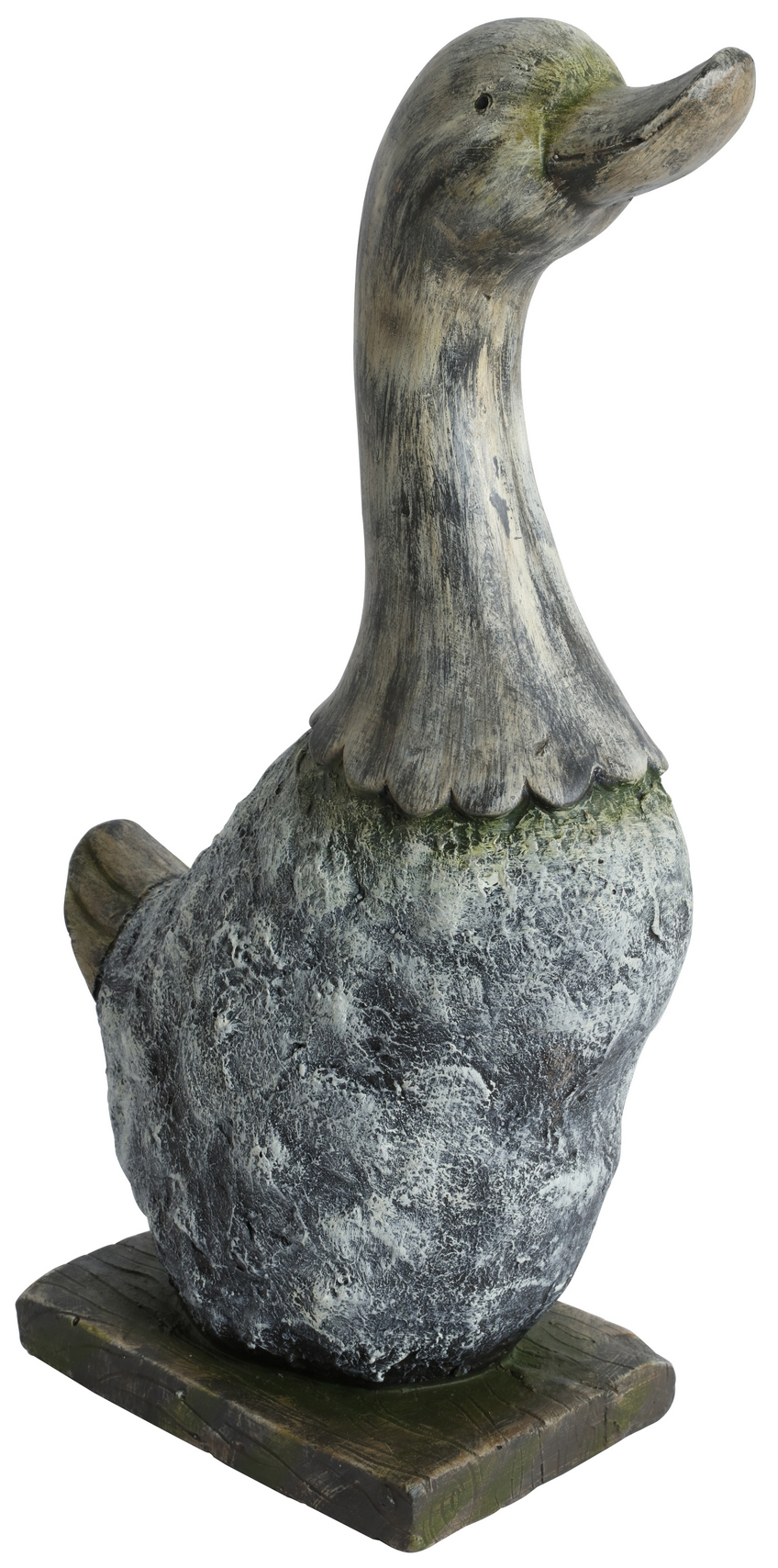 Hagekunst som forgyller tilstedeværelsen i ens hage. Sittende and i stein.