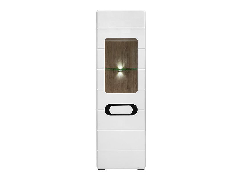 Et eikeskap med hvite høyglans fronter. Det elliptiske sorte glasset fungerer som et håndtak og gir også en følelse av moderne design. Med glasseksjonen i døren kan du vise frem dine fineste dingser, som også er opplyst av den integrerte LED-belysningen.