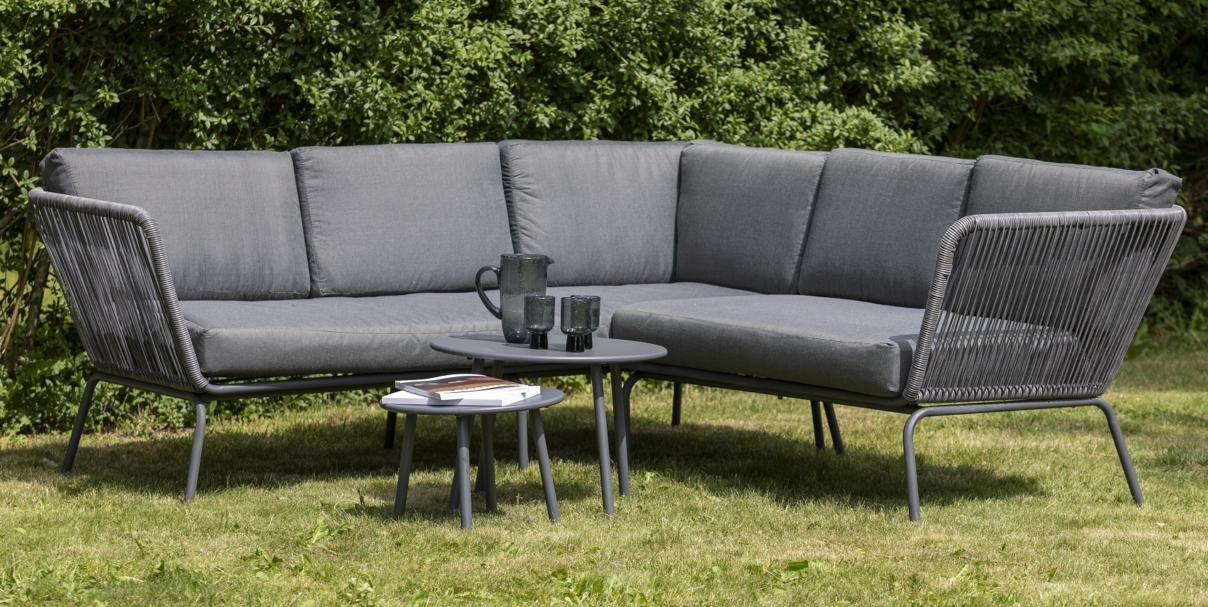 Halmby sofagruppe med stamme i mørkegrå aluminium / kunstrotting samt grå sete- og ryggputer. Settet inneholder også 2 stk salongbord.