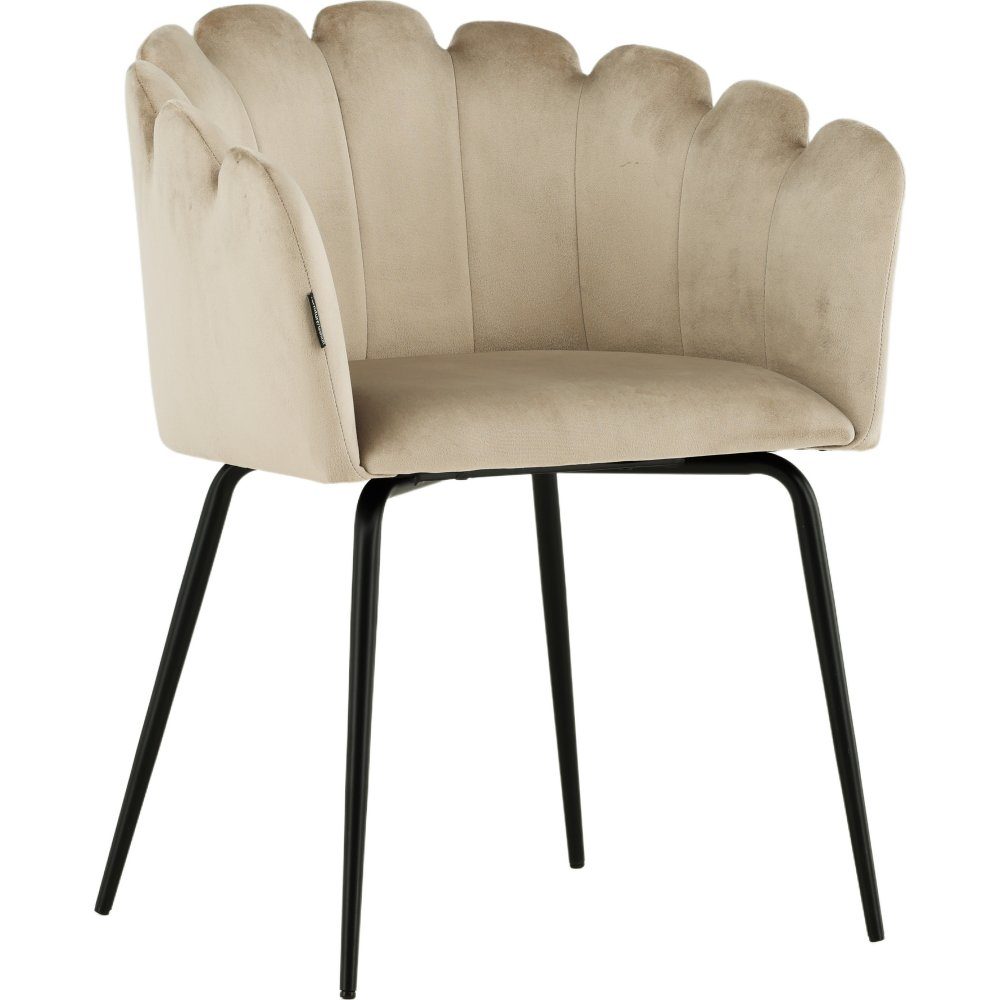 Spisestuestol i innbydende design med dekorativ snegleformet rygg med dekorative sømmer og et rundt sete i smakfullt beige fløyelsstoff. Bena er i sort pulverlakkert metall. Skap et trendy blikkfang i hjertet av hjemmet og sett deg komfortabelt rundt spisebordet.