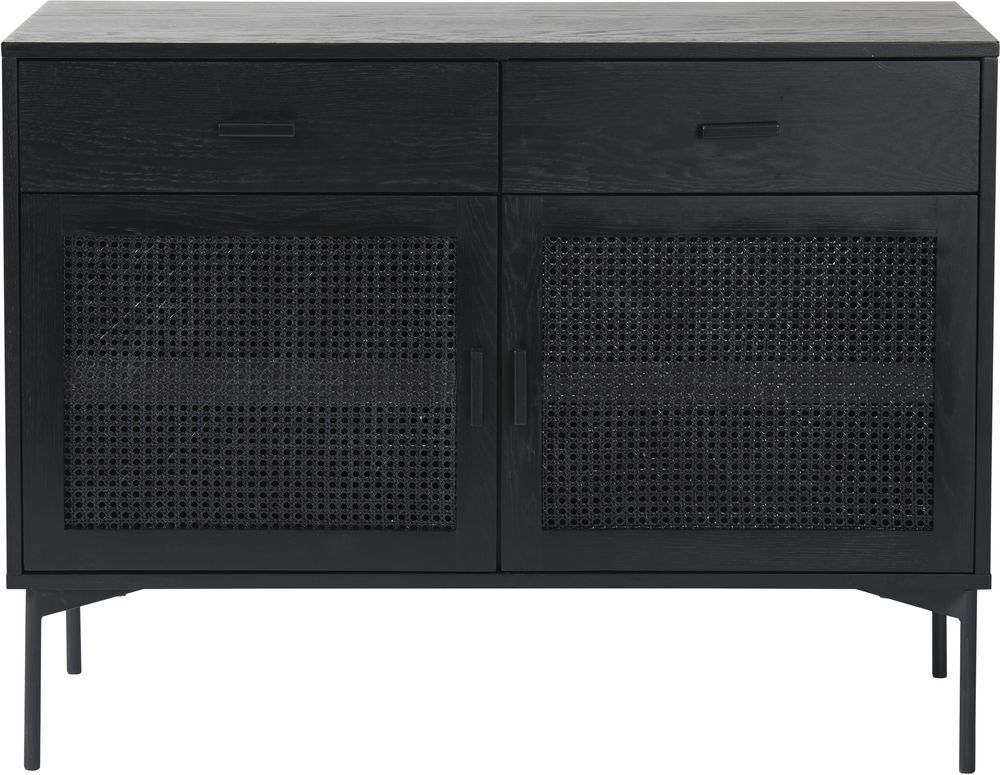Pent sideboard i svart eikfinér, rotting i dørene. Ben av svart metall.
