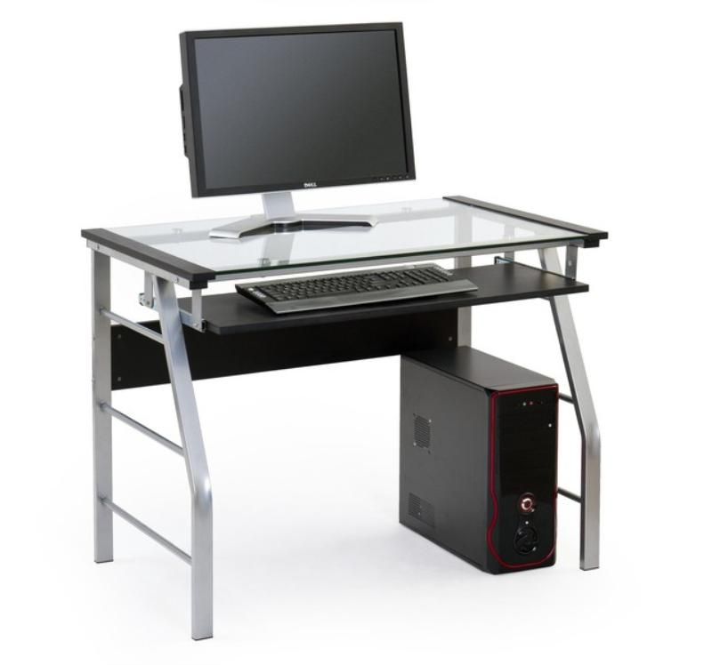 Stilig skrivebord med et moderne design. Basen er i forkrommet metall med et stilig design, og bordplaten er i klarglass med en praktisk uttrekkbar underhylle for plassering av tastatur og mus.