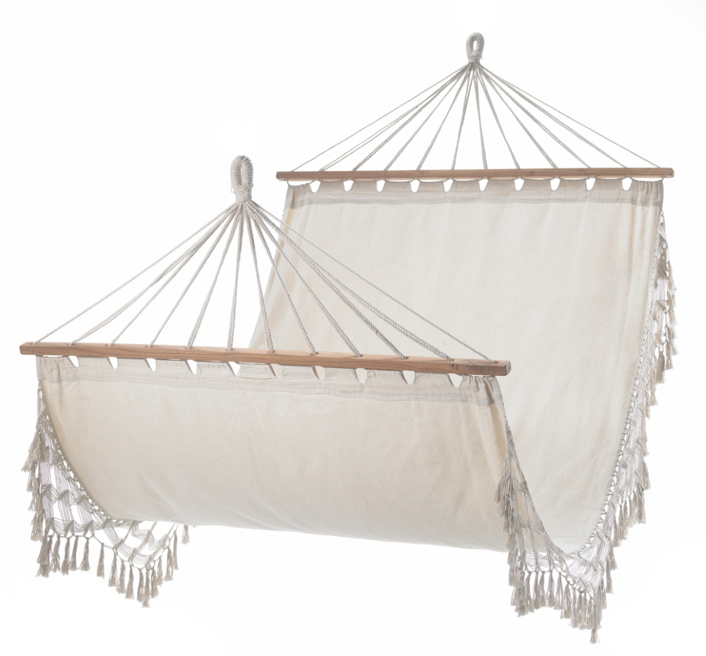 En koselig og stilren hengekøye som lett monteres på plass. Laget av ubleket ufarget bomull.
