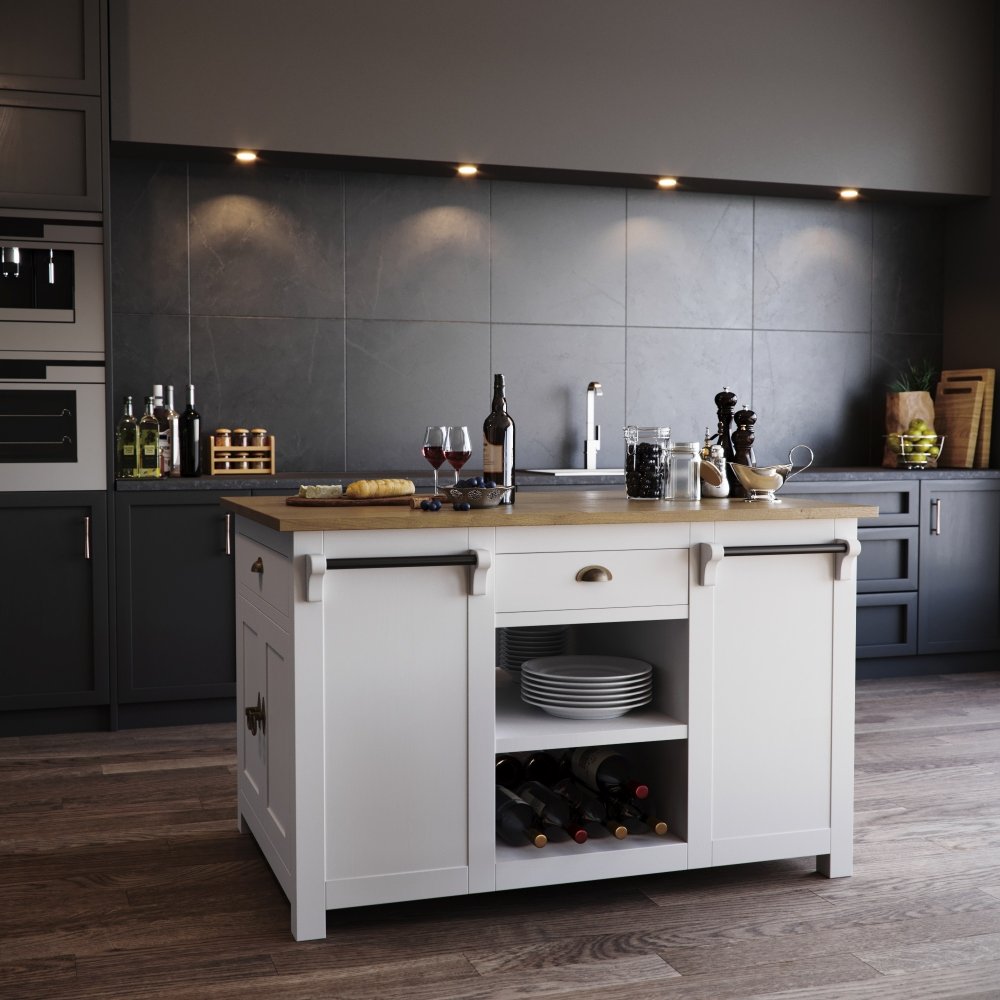 Heritage kjøkkenøy hvitlakkert blir hjertet i kjøkkenet. En praktisk kjøkkenøy med gode oppbevaringsmuligheter i både skap og skuffer og en ekstra arbeidsoverflate. Leveres i 3 stk fabrikkmonterte moduler som man skrur sammen med topplaten. Topplaten i massivt tre med oljet eikefinèr!