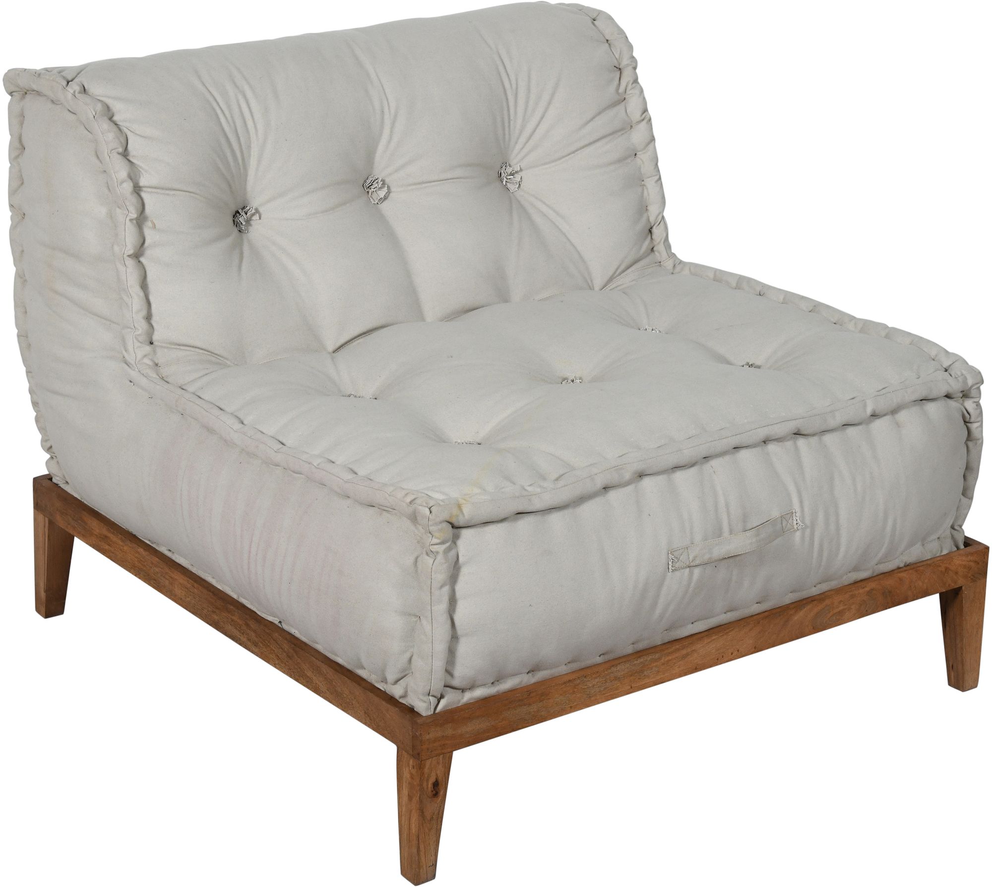 Ravlunda lenestol med solid ramme av tre i mørkere farge. Tykk, grå sittepute av bomullskanvas med knapper i sete og rygg. En perfekt hvilestol og flott innredningsdetalj.