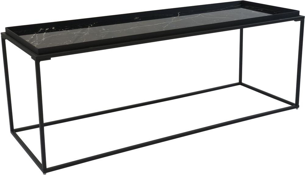 Moderne sofabord i marmor laminert glass med understell i svart pulverlakkert metall.