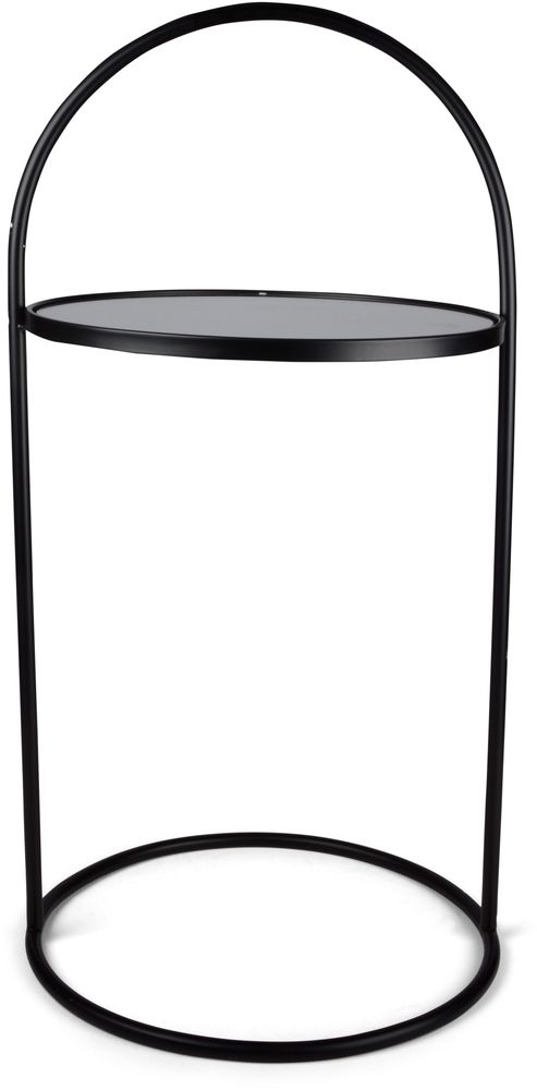 Et pent hjørnebord med en moderne design. Tilvirket i svart metall med en bordplate i klarglass og et praktisk håndtak for lett forflytting.